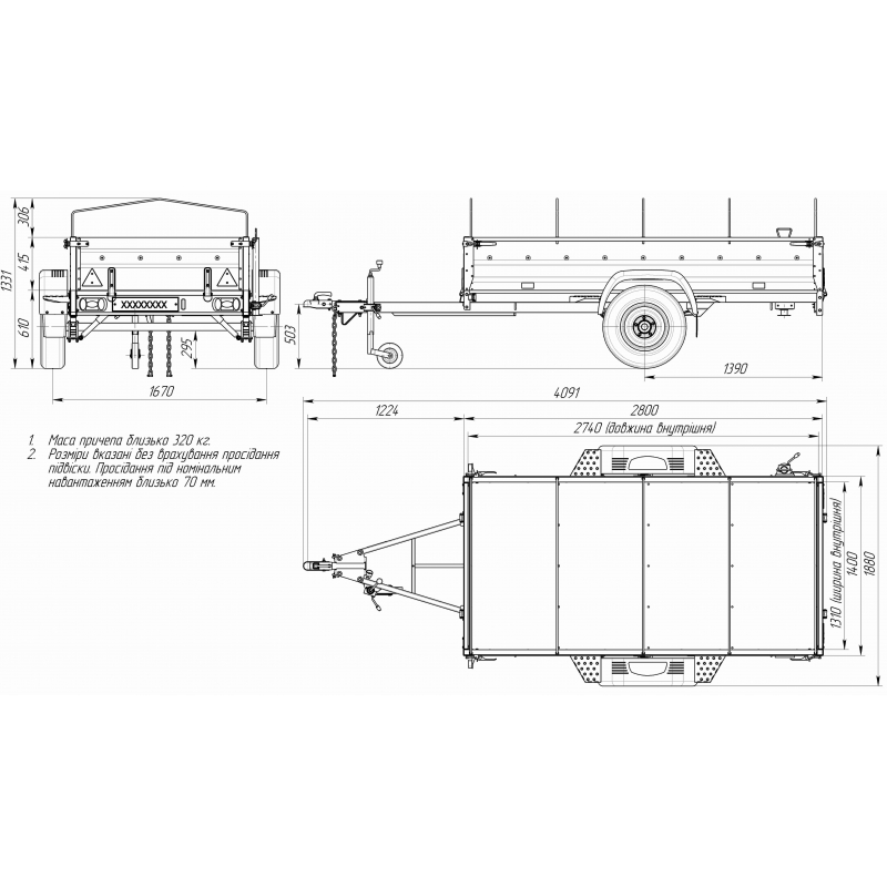 Ресори німецького виробництва, обслуговує дворядний підшипник закритого типу, борти причепа оцинковані, рама оцінкована. Днище виготовлена з вологостійкої фанери, товщиною 12 мм